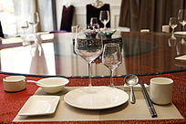 盘子上有一个玻璃杯和碟子图片