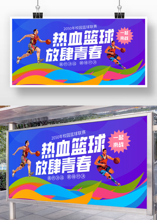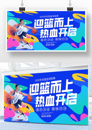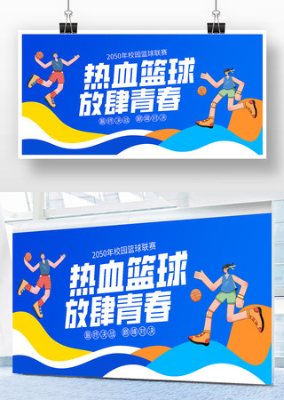 蓝黄色插画风大学校园篮球社团招新宣传海报