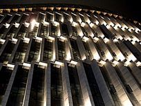 穿着黑色皮夹克微笑女人站在外面一栋大楼前