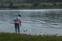 亚洲男孩坐在长凳上背上背着一个背包高清图