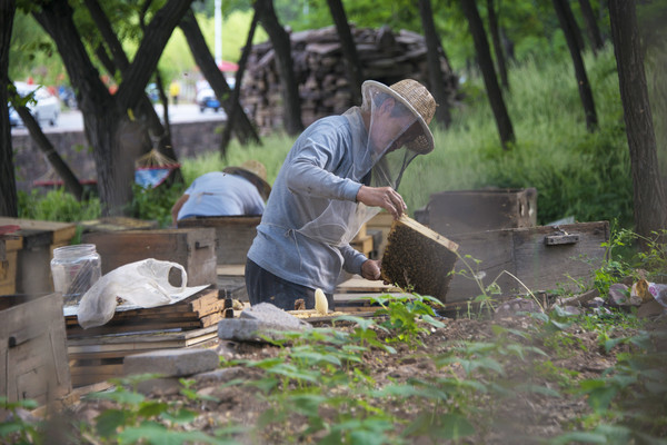 养蜂人手里拿着满是蜜蜂的蜜蜂框