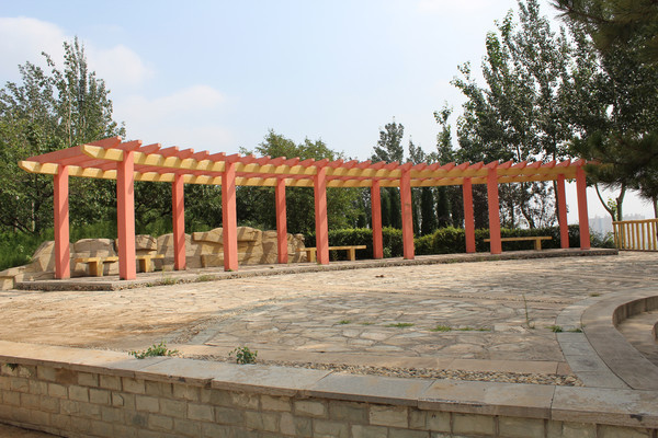 夕阳下水池水塘水泥护栏梨花节梨树王景区
