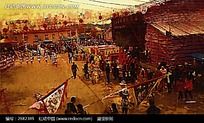 龙运亨通舞狮焰火中国红庙会春节插画海报