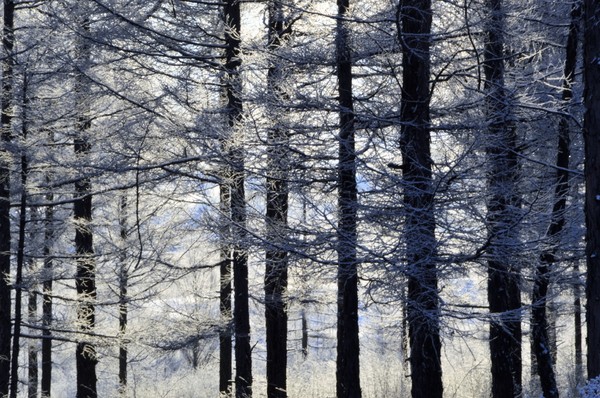 冬日森林里苔藓覆盖的树干与雪覆的树冠共舞